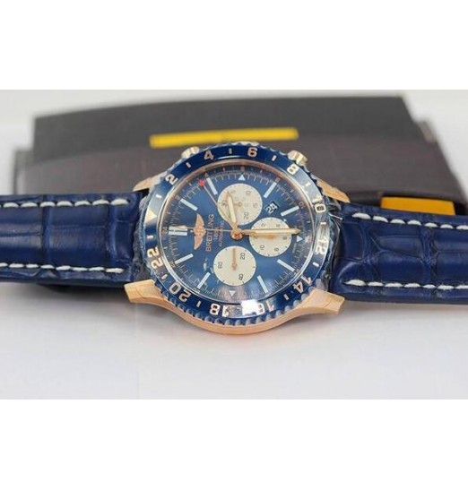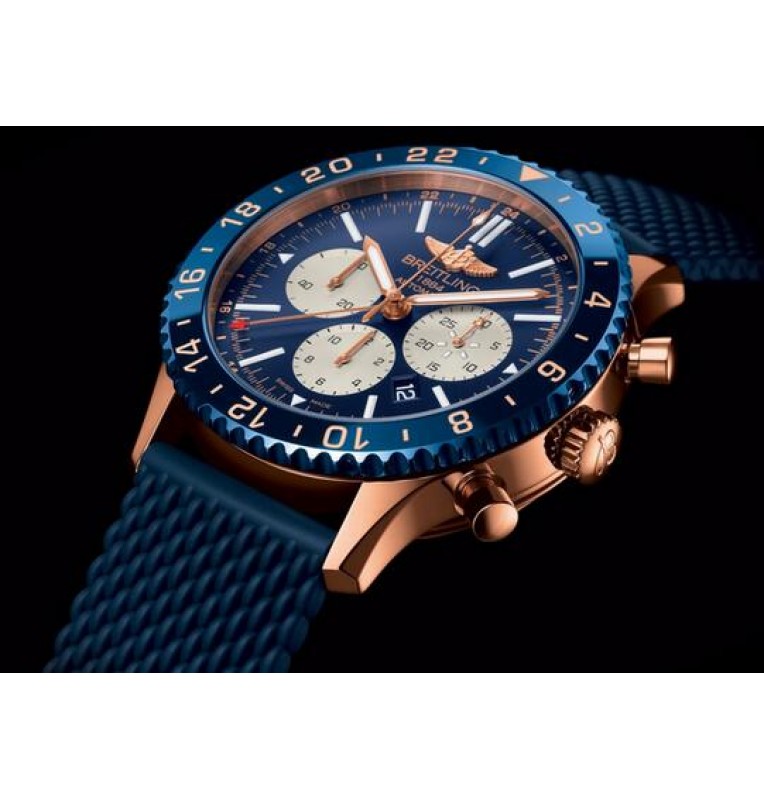 Este Breitling Chronoliner cuenta con un acero de 46 mm con bisel de cerámica, caja de oro rojo de 18 quilates en un caucho Aero Classíc, Ocean Classíc. Equipado con un bisel bidireccional y el movimiento mecánico de autoenrollado, movimiento de zonas horarias segunda y tercera (24 horas) con un minimo de 70 hrs reserva de potencia. Una vivida esfera Roja oro (limitada) - Azul se encuentra detras de índices de horas y minutos que le dan a este reloj una excelente legibilidad, incluso a 100 m de profundidad. La caja esta rematada con un zafiro cambray, a prueba de resplandor laterales de cristal y sín tornillos, dos juntas de corona. Reciba envios y devoluciones de cortesía con cada reloj Breitling.