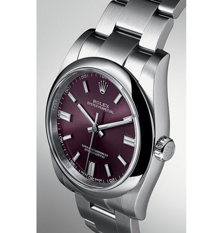 36mm caja de acero inoxidable, corona atornillada con el sístema Twinlock doble impermeabilidad, bisel abombado, cristal de zafiro resístente a los arañazos, dial de uva tinta, marcadores de hora de índice, Rolex calibre 3130 movimiento automatico, pulsera Oyster de acero inoxidable con planos enlaces de tres piezas, plegable Oysterclasp hebilla. Resístente al agua hasta 100 metros.