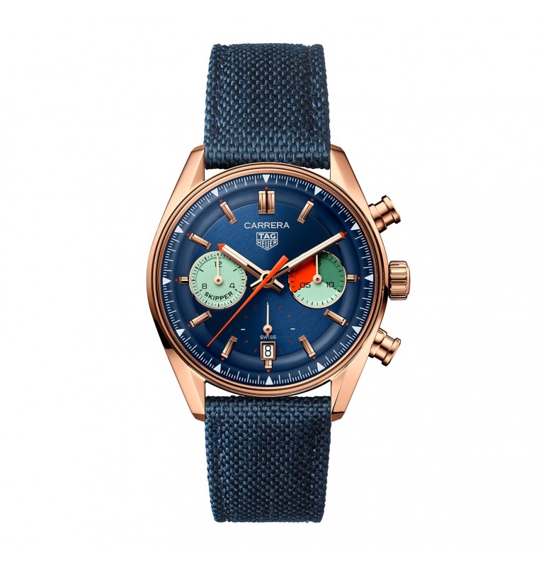 Embarca con el TAG Heuer Carrera Skipper, una obra maestra de 39 mm en oro rosa macizo 5N de 18 quilates. Su esfera azul presenta una cuenta atras de regata unica, que combina lujo con funcionalidad. El movimiento interno TH20-06 esta Disenado para la precision de la navegacion, mientras que la correa de tela azul de alta gama encarna el espiritu aventurero del mar.