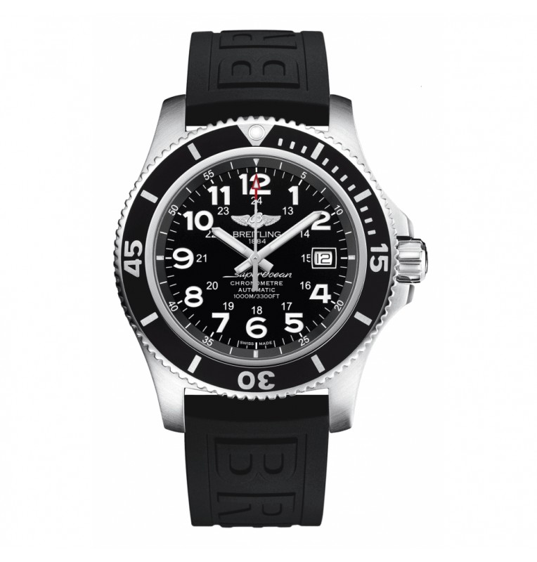 Descripcion del producto - Reloj Breitling Superocean II Automatic 44 Steel. Referencia del modelo: A17392D71B1S2. Caja de acero inoxidable. Esfera negra. Movimiento automatico. Correa de caucho negra y hebilla desplegable de acero.