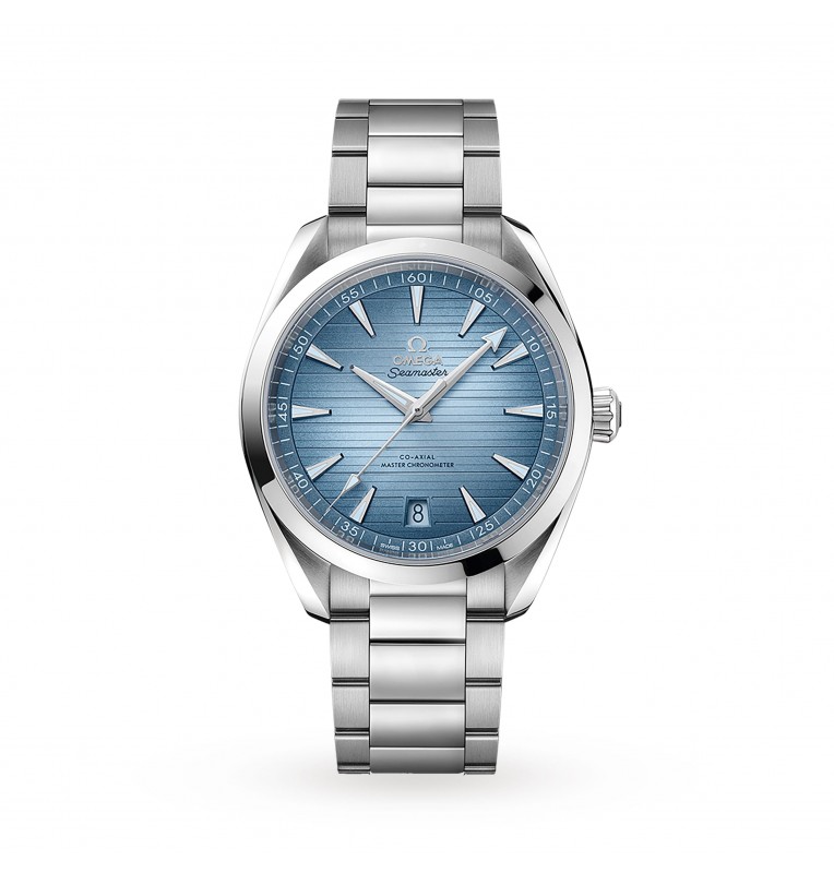 Este Aqua Terra de 41 mm, con una caja simetrica de acero inoxidable pulido y cepillado, tiene un brazalete de acero a juego.