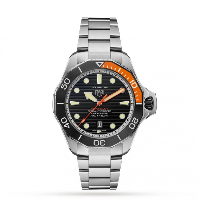 La caja de titanio de grado 5 de 45 mm del TAG Heuer Aquaracer Professional 1000 Superdiver tiene un protector de corona y una valvula de escape de helio para soportar 1000 m de profundidad. La esfera negra cepillada con rayos de sol tiene indices grandes y manecillas rellenas de Super-LumiNova, asi como todas las marcas en el bisel para garantizar la visibilidad cuando es importante. El TAG Heuer Aquaracer Superdiver viene equipado con una funda protectora personalizada con detalles en naranja y una luz de marcha atras para ayudarte a subir el liston.